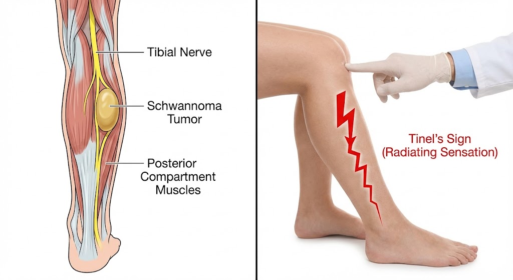 โรค Schwannoma คือการที่เซลล์ฉนวนพวกนี้มันแบ่งตัวผิดปกติ จนโตขึ้นมาเป็นก้อนกลมๆ หรือรีๆ เกาะอยู่ที่เส้นประสาท โดยเฉพาะที่ "เส้นประสาททิเบียล" (Tibial Nerve) ซึ่งเป็นเส้นประสาทหลักที่อยู่หลังข้อพับเข่า วิ่งลงมาที่น่อง และเข้าสู่ข้อเท้าด้านในครับ